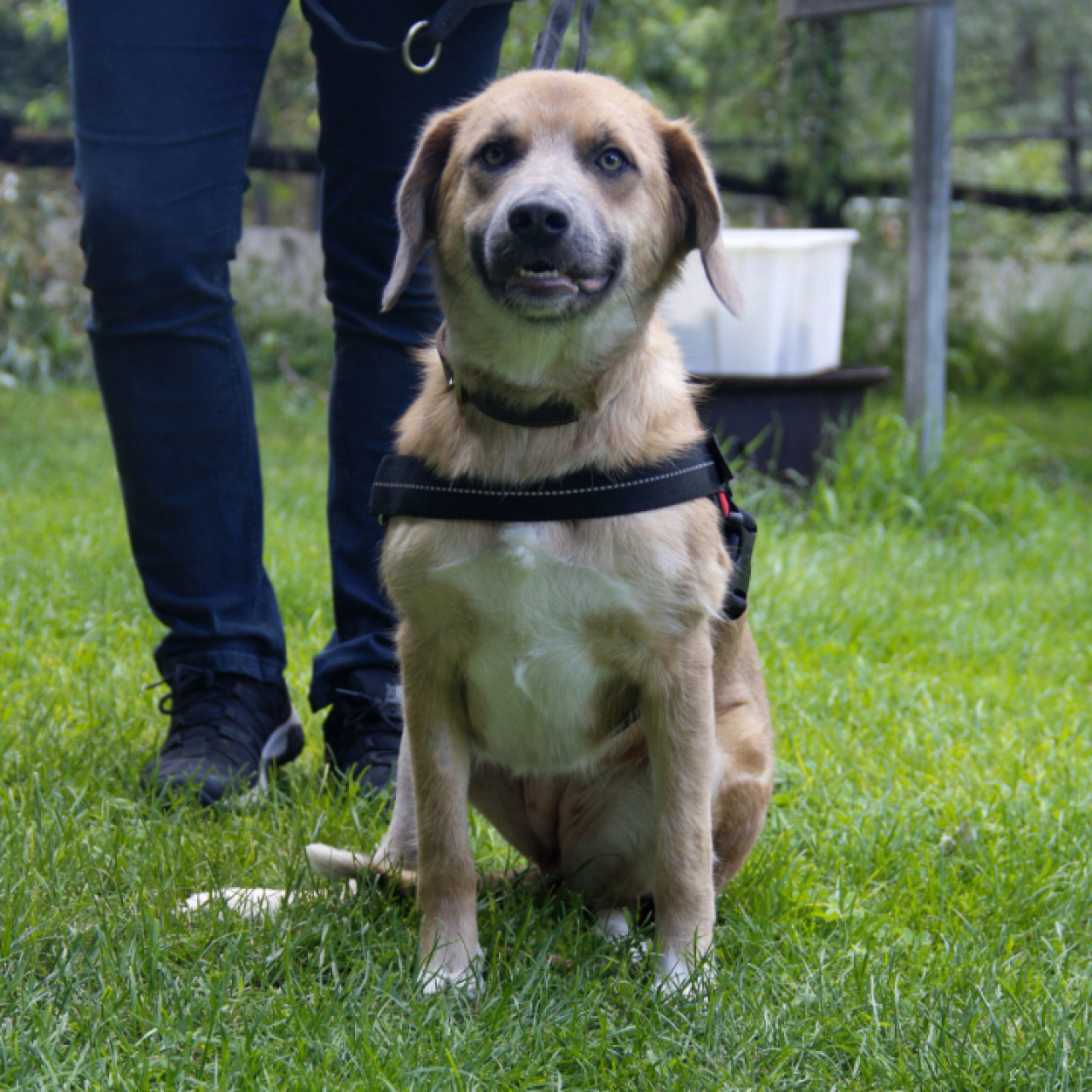 Kira 2025.05.07-én került gondozásunkba, egy kedves állatbarát keresett fel minket, hogy segítsünk Kira elhelyezésében. Még az év elején sérülten találta az utcán és azonnal állatorvoshoz vitte, ahol kiderült, hogy combcsontja ketté tört. Megtalálója vállalta az orvosi költségeket és lábadozása idejére elhelyezését, sajnos munkájából (mivel sokat utazik egy nap) kifolyólag nem tudta teljes felelősséggel magához venni, így felkeresett több Alapítványt is, hogy segítsünk Kira további elhelyezésében, illetve keressünk neki szerető családot.