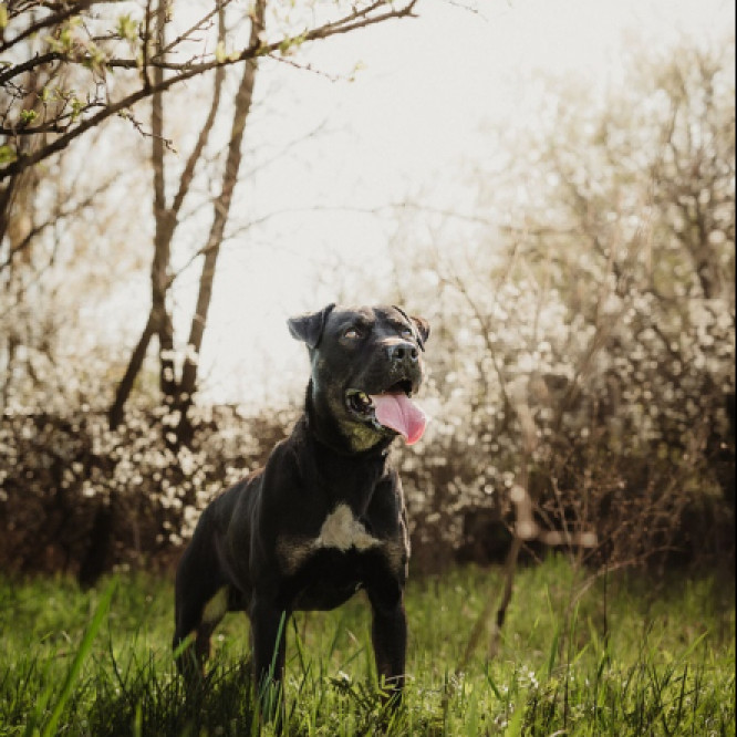 Más kutyákkal szoktatható, igényli is, boldogan sétált màr együtt más szuka kutyával, nem lép fel támadóan velük szembe. Viszont se gyerek, se idős ember mellé nem adjuk. Cicákkal se ismerjük a viszonyát tesztelni se tudjuk.