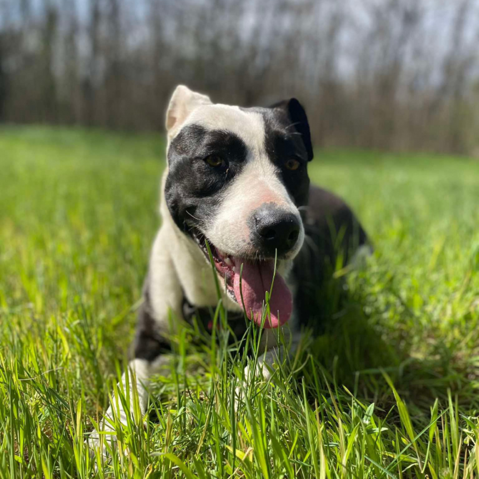 Egy fiatal, kb 2023 év eleji születésű oltott, chipezett, ivartalanított kb 25 kg-os kesze-kusza fülecskével rendelkező staff keverék szuka kutya.