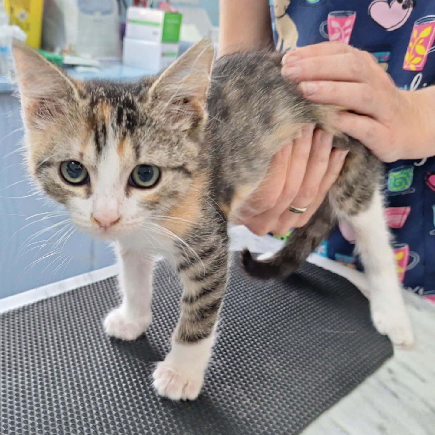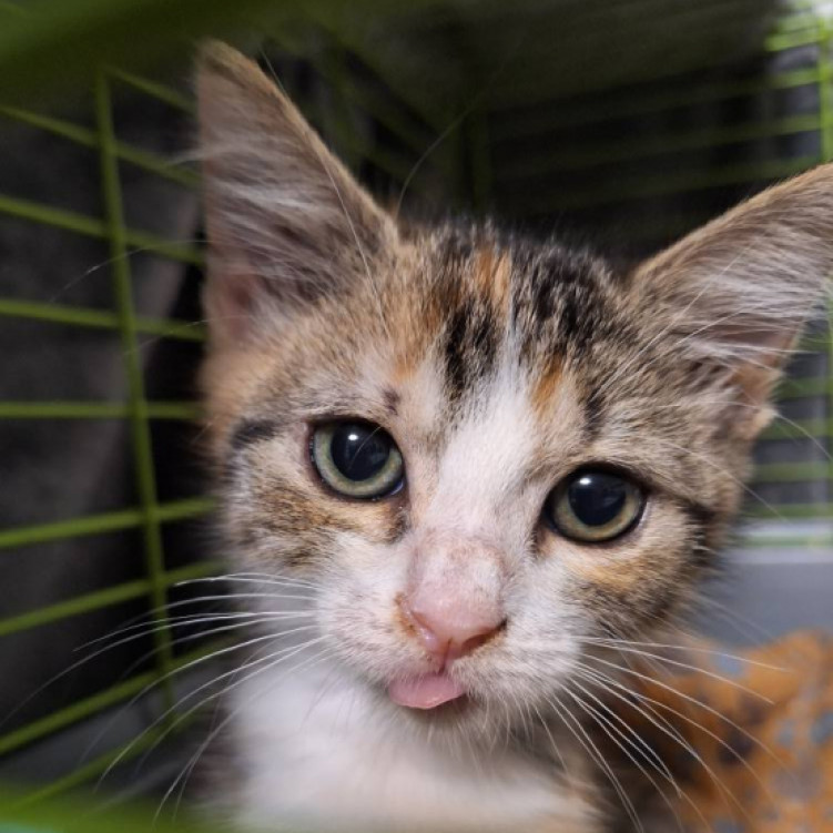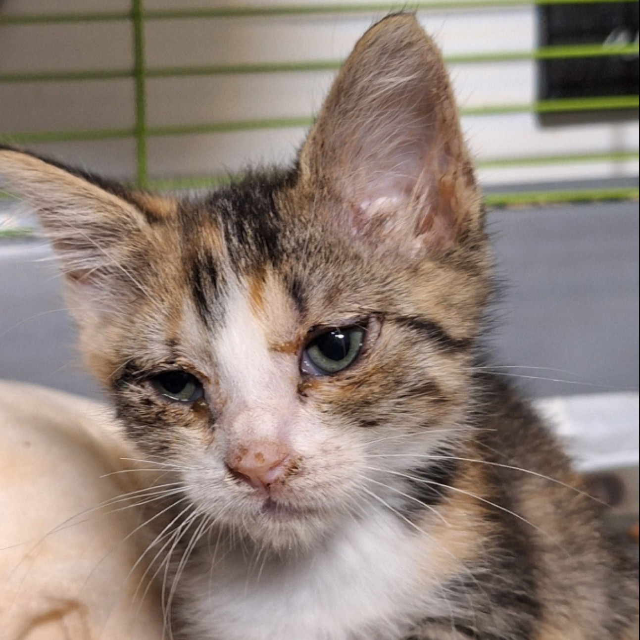 Hanga 2025 augusztus elején születhetett és kb 3 hetesen került a gondozásunkba nagyon rossz állapotba. Macskanáthás volt, a szemei teljesen össze voltak ragadva, így vakon botorkált egy erdős területen. Nálunk a náthán túl giardiára is kapott kezelést. Hosszú ideig tartott, mire elfogadható állapotba került és az induló betegségeinek túl emésztési gondokkal is meg kellett küzdenünk. Sajnos a szilárd táplálékra átállás nem ment egyszerűen, nehezen emésztett, többször kellett rásegítés, hogy kiürüljön a pocakja.