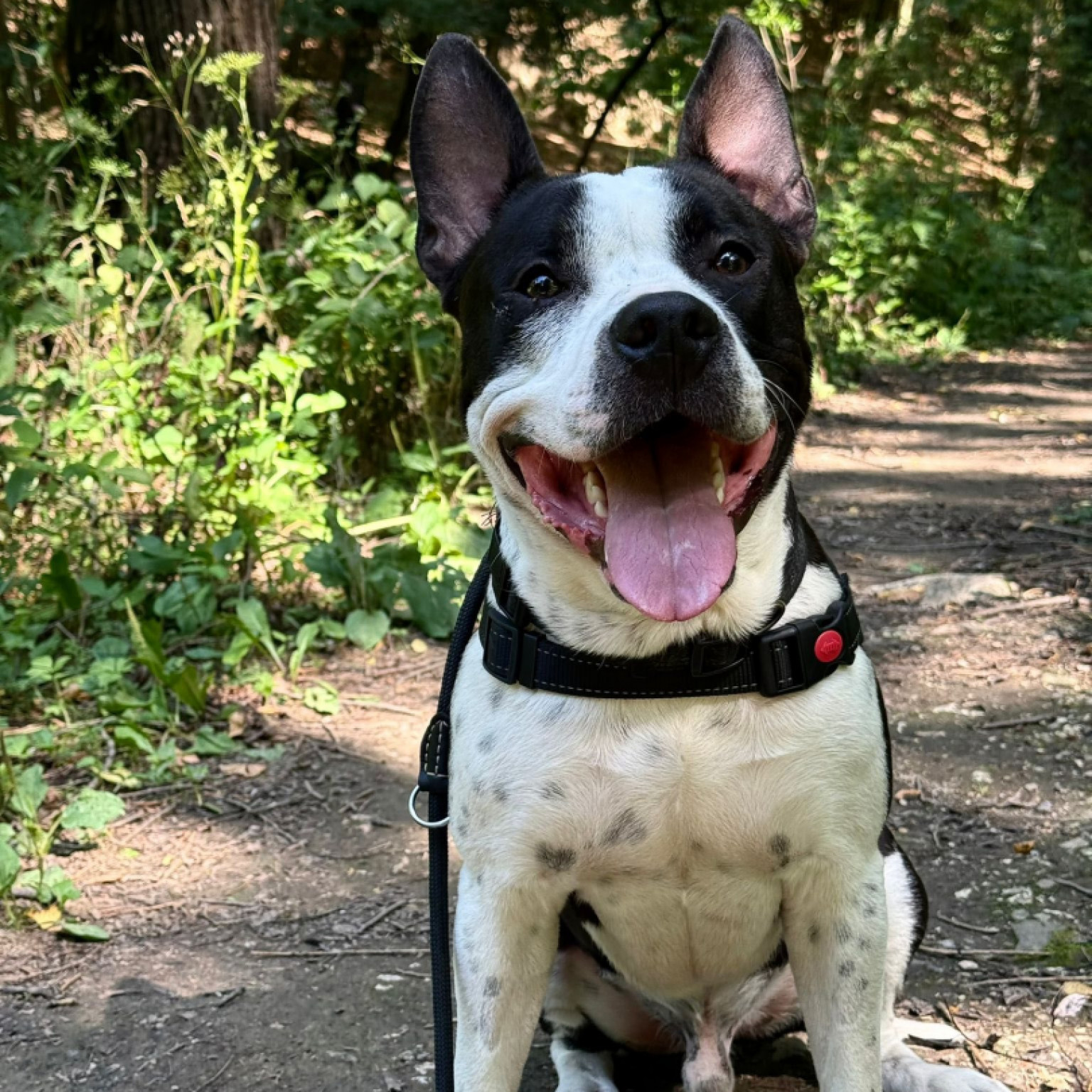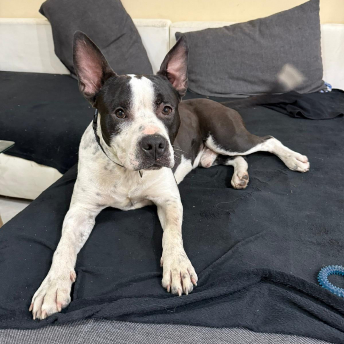 Fiatal, talán 2023-as születésű (még) ivaros kan staffordshire jellegű kutya.