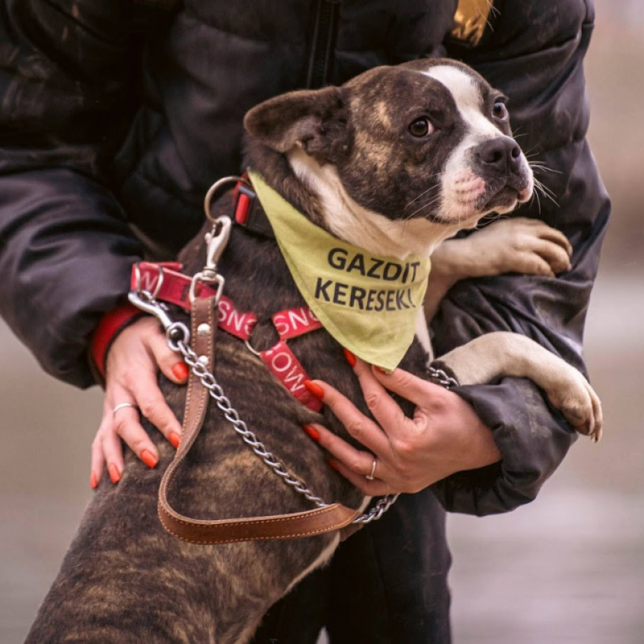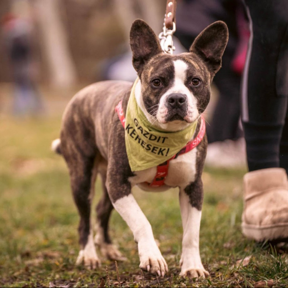 Gyagyapók a gyömrői menhely felszámolásából érkezett hozzánk, egy vicc kutya, 15 kg körüli bull típusú keverék kan. Kompatibilis más kutyákkal, egy agilis és lelkes, jó természetű kutya. Nagyon fázós, neki melegben lenne mindig a helye. Szerintünk szép is, de tudjuk, hogy a bull típusú kutyáktól sokan félnek, tartanak. Gyagyapók minden előítéletre rácáfol, a szívéig csókolja az embert.