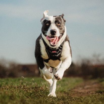 Egy fiatal, kb 2023 év eleji születésű oltott, chipezett, ivartalanított kb 25 kg-os kesze-kusza fülecskével rendelkező staff keverék szuka kutya.