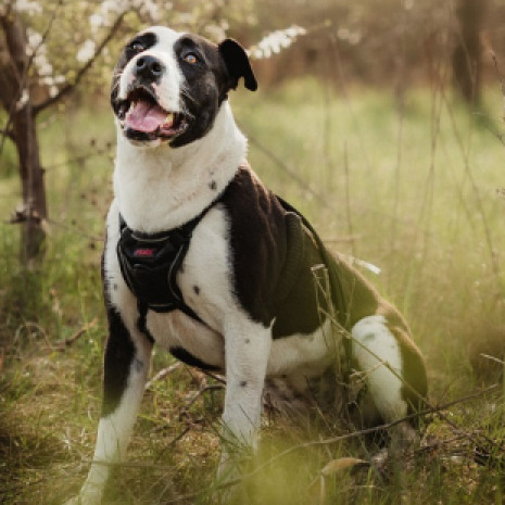 Egy fiatal, kb 2023 év eleji születésű oltott, chipezett, ivartalanított kb 25 kg-os kesze-kusza fülecskével rendelkező staff keverék szuka kutya.